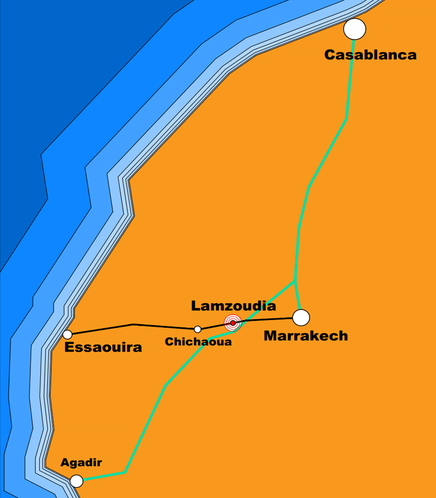Prenez l'autoroute A3 en direction de Marrakech. A environ 50 km de Marrakech, prenez à droite la direction d'Agadir. Ensuite vous sortez à Marrakech-Loudaya-Sidi Zouine
